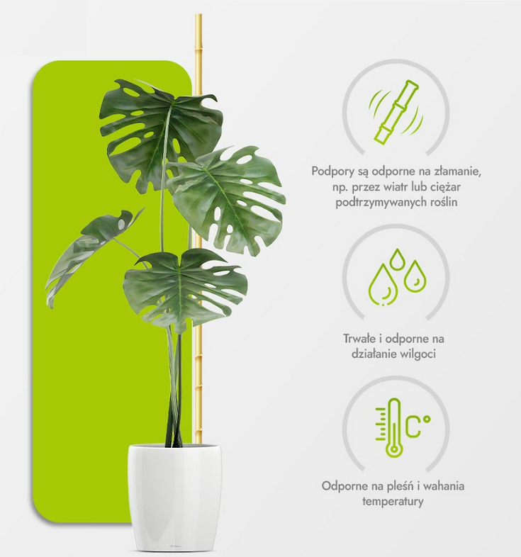 Bamboo poles are a raw material of natural origin, distinguished by their high strength and resistance to adverse weather conditions; they are insensitive to temperature changes and do not absorb water. For this reason, bamboo poles work well for both houseplants and garden plants. What's more, they are resistant to breakage, yet flexible enough to provide the plant with stable support and safe growth. Additionally, bamboo poles are very easy to install and to extend already existing structures. You only need one pole to support a plant - you can, of course, insert two or three to create different structures to stiffen the given plant. The plant is either tied or pinned to the poles.