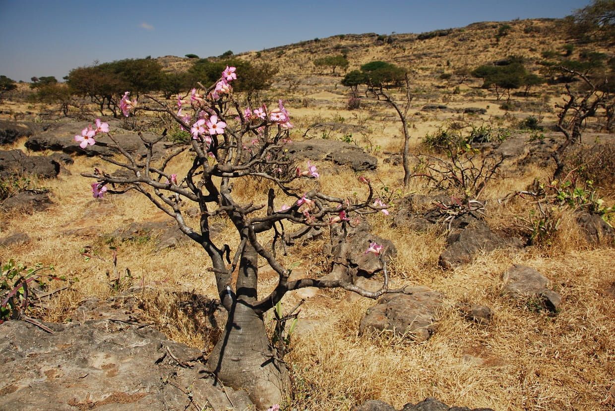 Roślina nazywana różą pustyni. W środowisku naturalnym rośnie na terenach pustynnych i półpustynnych Afryki Środkowej oraz na Półwyspie Arabskim. Ma formę kwitnącego drzewka przypominającego baobab. Łodyga jest masywna, szeroka dołem, cieńsza górą. Posiada zdolność gromadzenia wody. Z grubego pnia wyrastają masywne pędy. Liście są są błyszczące , ciemnozielone. Adenium kwitnie okazale od kwietnia do września, kwiaty są pięciopłatkowe, maja średnicę 5-12 cm. Są zebrane w pęczki o intensywnie różowym kolorze.