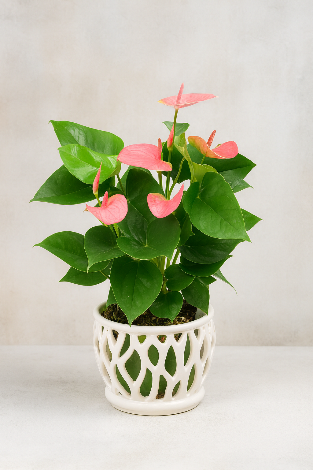 Anthurium Sweet Dream Royal Pink to niezwykle efektowna odmiana anthurium o dużych, błyszczących liściach i wyjątkowych, różowo-kremowych kwiatostanach. Jej delikatna kolorystyka w odcieniach pastelowego różu i subtelnego beżu sprawia, że roślina prezentuje się elegancko i luksusowo – doskonale komponuje się z nowoczesnymi, glamour oraz skandynawskimi wnętrzami. To roślina doniczkowa, która zachwyca przez cały rok – jej kwiaty utrzymują się przez wiele tygodni, a przy odpowiedniej pielęgnacji Anthurium zakwita wielokrotnie.