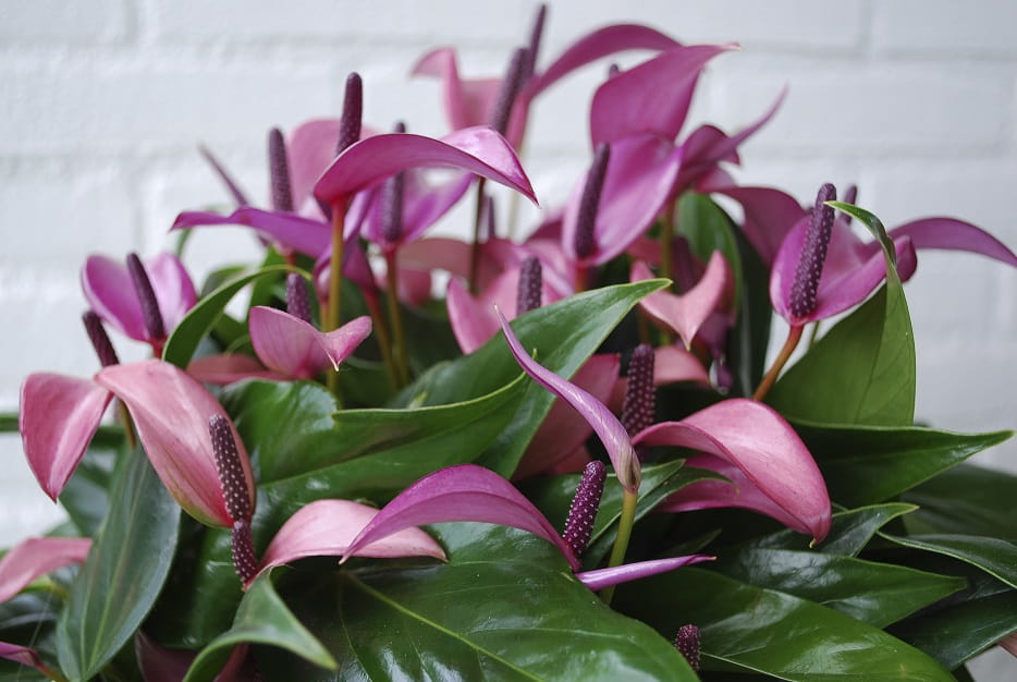 Anturium to roślina pochodząca z lasów tropikalnych Ameryki Środkowej. Posiada owalne, spiczasto zakończone ciemnozielone liście, oraz kwiaty o intensywnym fioletowym kolorze zebrane w kolbę. Odpowiednio pielęgnowana może kwitnąć przez cały rok. Rośliny osiągają wysokość 50-90 cm. Liście należy przecierać regularnie wilgotną szmatką, nabłyszczać co 8 tygodni. Roślina jest mało wymagająca.