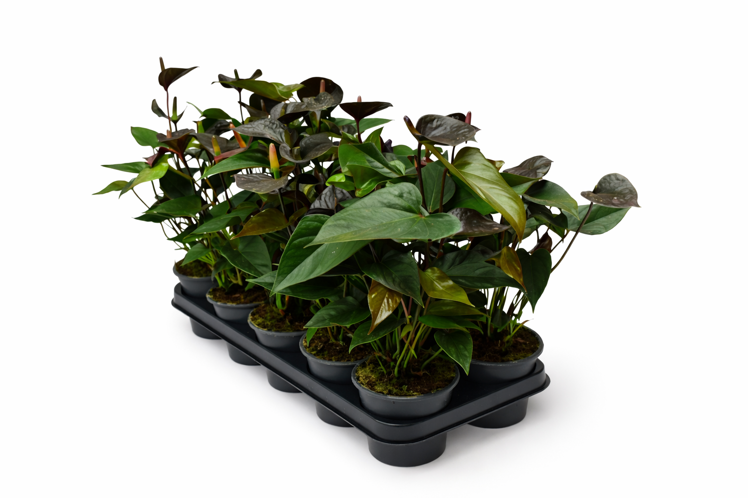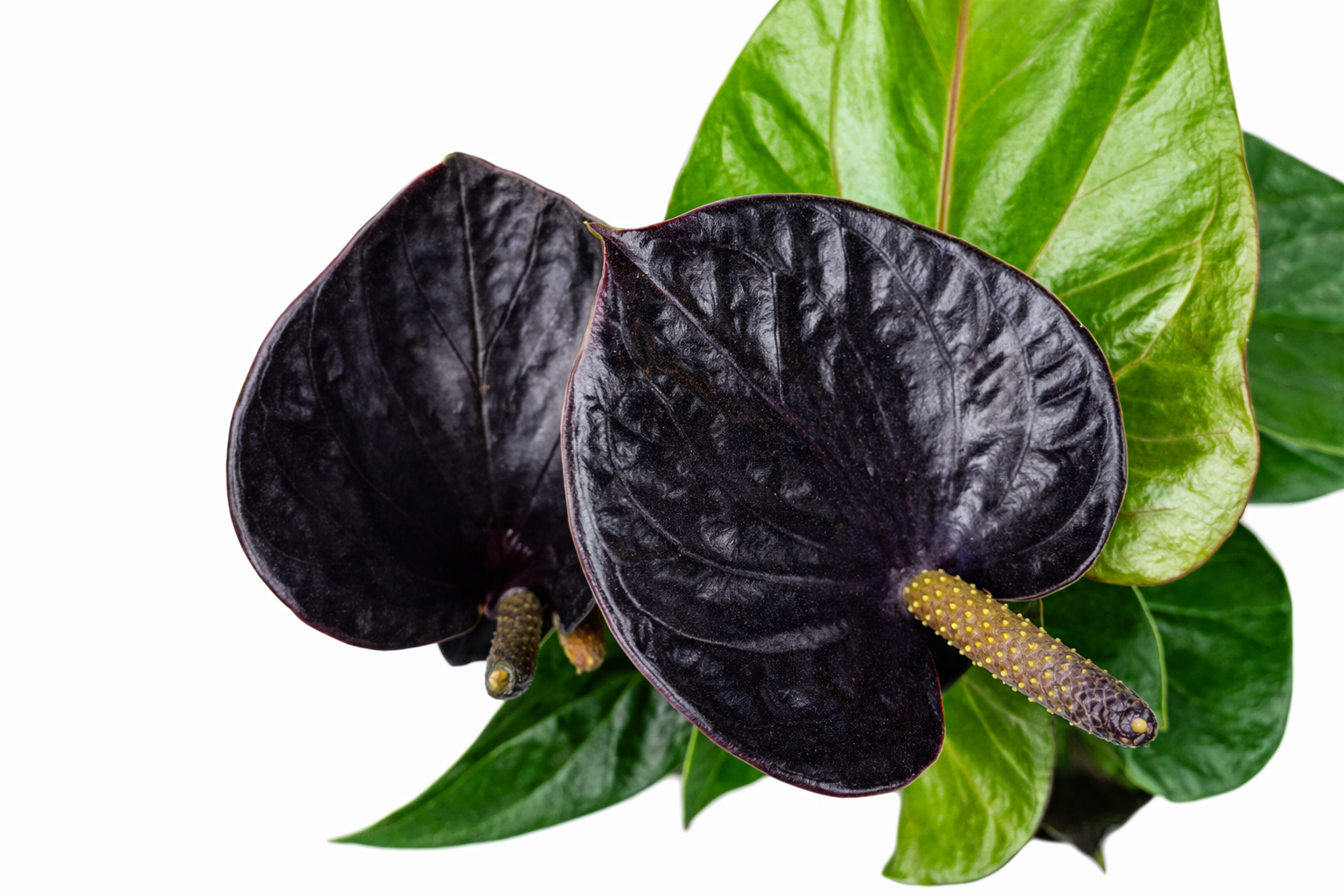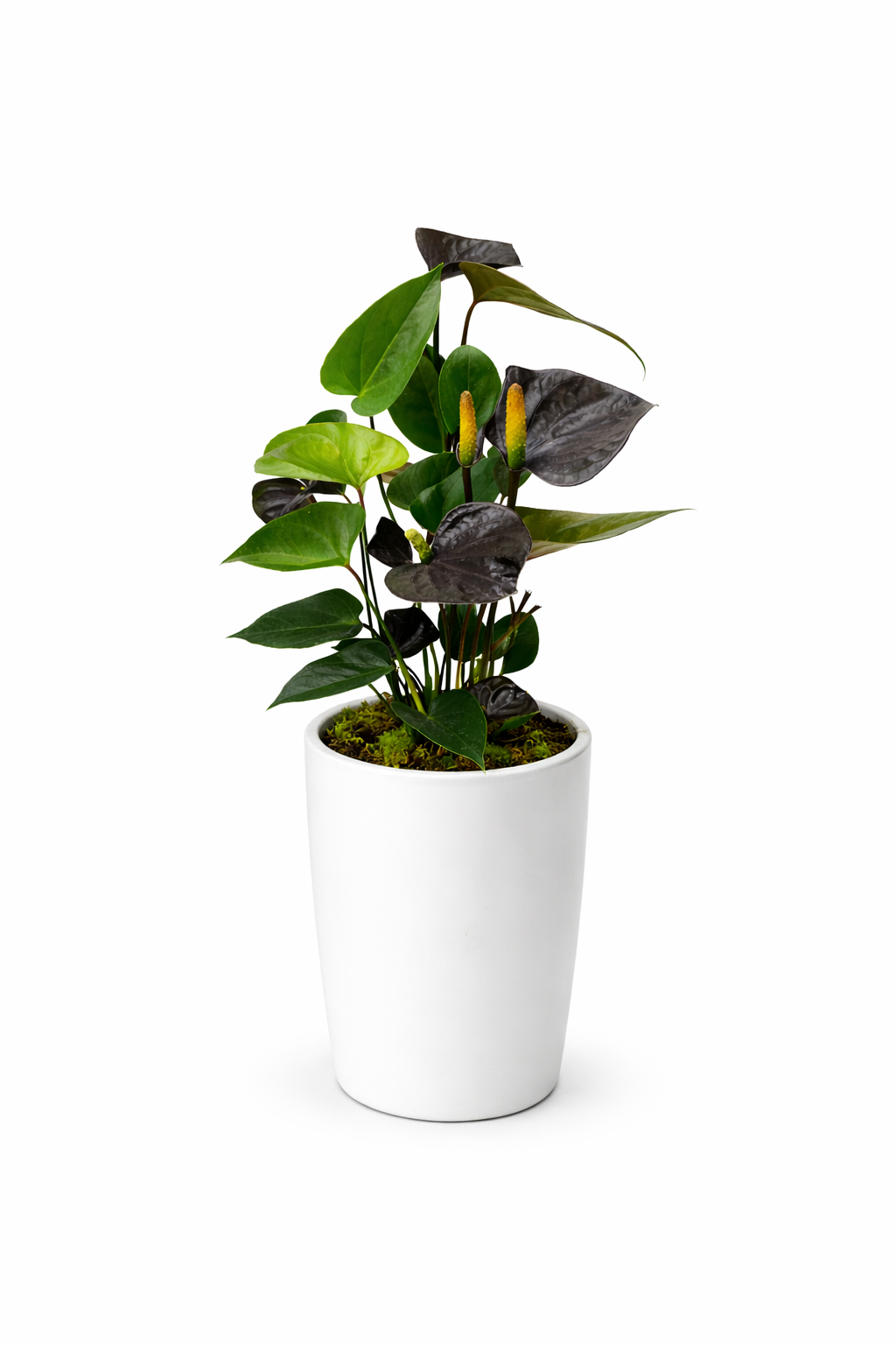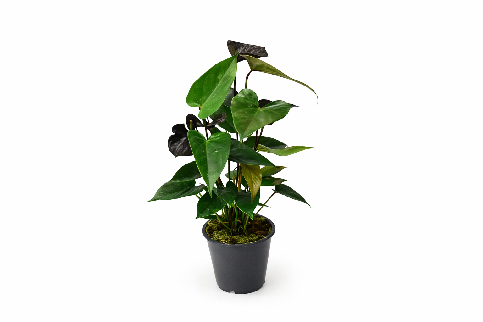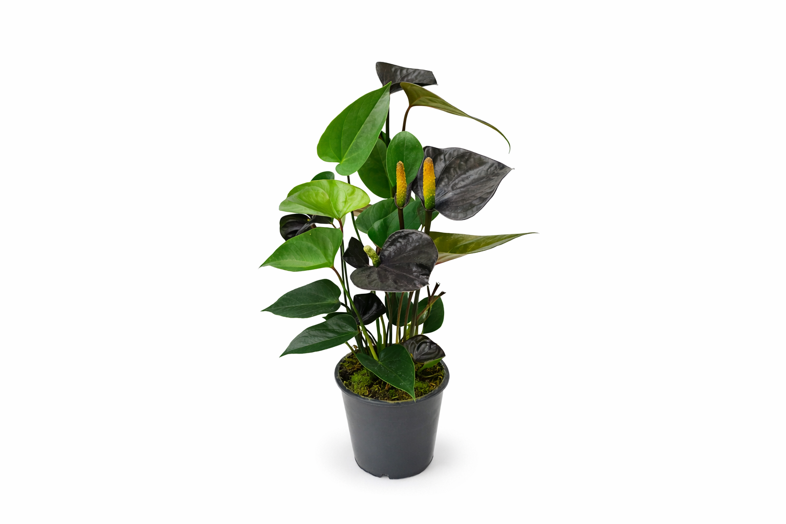 Anturium Black Love to niezwykle dekoracyjna roślina doniczkowa, która dzięki ciemnym, głęboko zielonym liściom i kontrastującym kwiatom wprowadza do wnętrza wyjątkowy klimat. Jej unikalna barwa liści i silny, pionowy pokrój sprawiają, że świetnie sprawdza się jako ozdoba salonu, gabinetu lub biura.