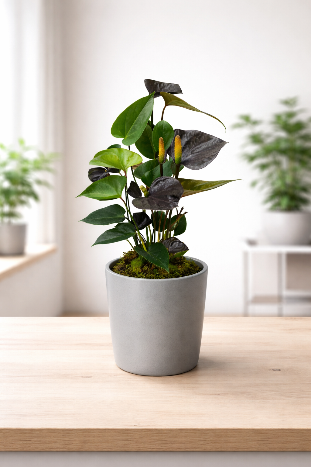 Anturium Black Love wyróżnia się na tle innych roślin swoimi głębokimi tonami i elegancką formą – doskonale wpisuje się w nowoczesne, loftowe i minimalistyczne aranżacje.