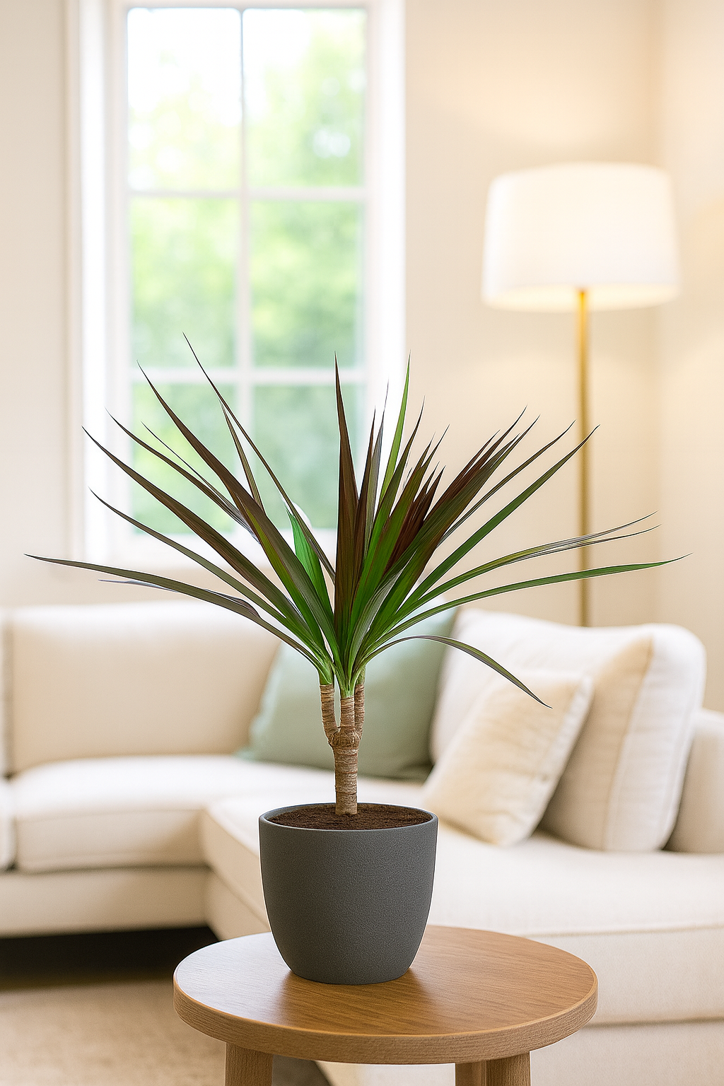 Dracaena Magenta, znana również jako dracena obrzeżona, to elegancka roślina doniczkowa o długich, smukłych liściach w odcieniach głębokiej zieleni z bordowo-fioletowymi brzegami. Jej wyrazista kolorystyka sprawia, że doskonale wpisuje się w nowoczesne i minimalistyczne wnętrza, dodając im egzotycznego charakteru i klasy.