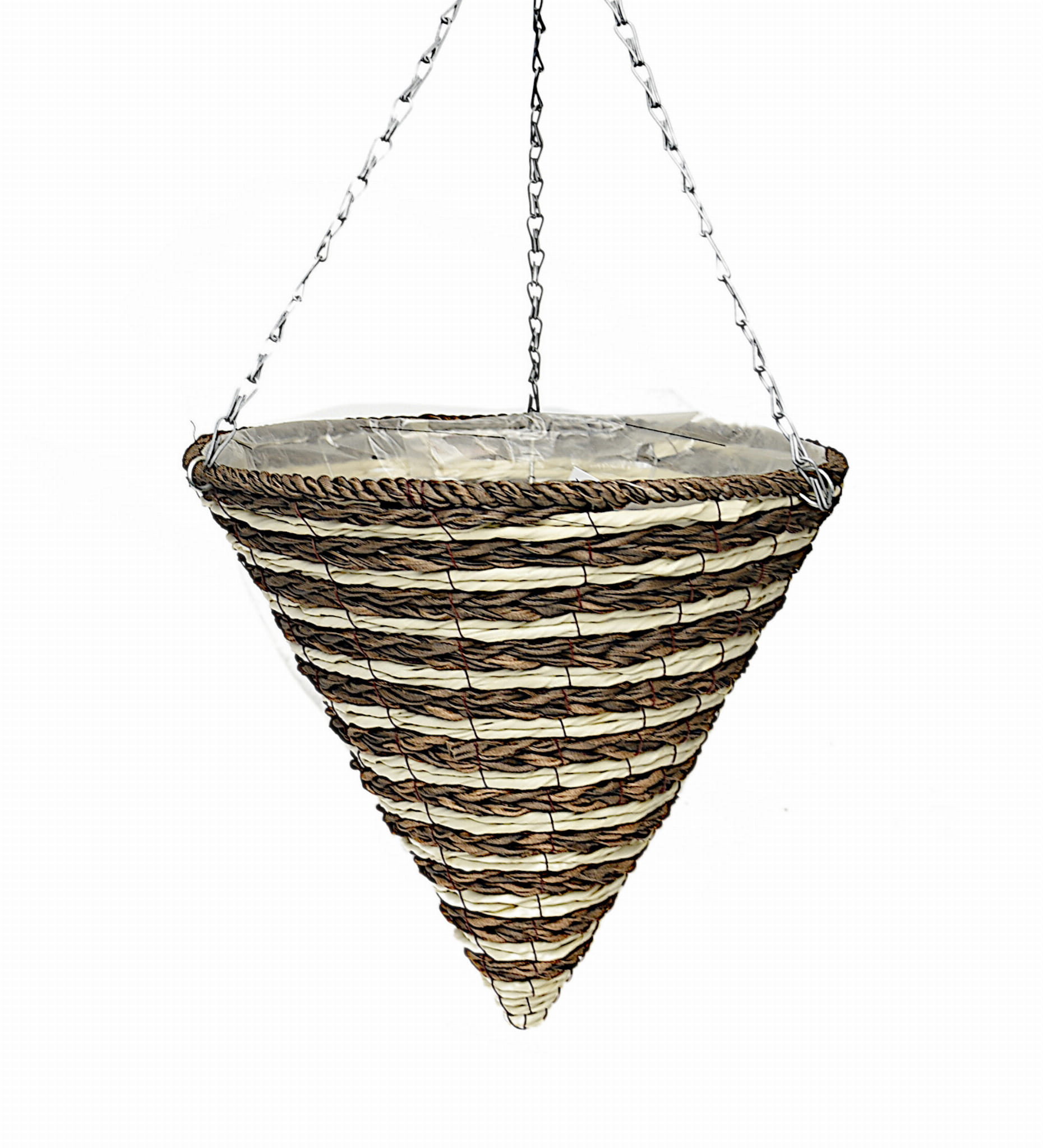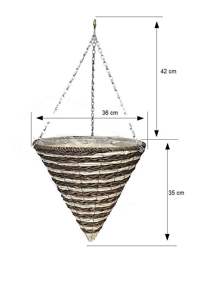 Wnętrze kosza wyścielone jest folią, co umożliwia sadzenie roślin bezpośrednio w jego wnętrzu, bez dodatkowych osłonek. Stelaż kosza wykonany jest z ocynkowanego drutu, co niewątpliwie zwiększa jego trwałość. Wykonany z naturalnych materiałów kosz podkreśli piękno żywych roślin, zwłaszcza tych o długich zwisających pędach.