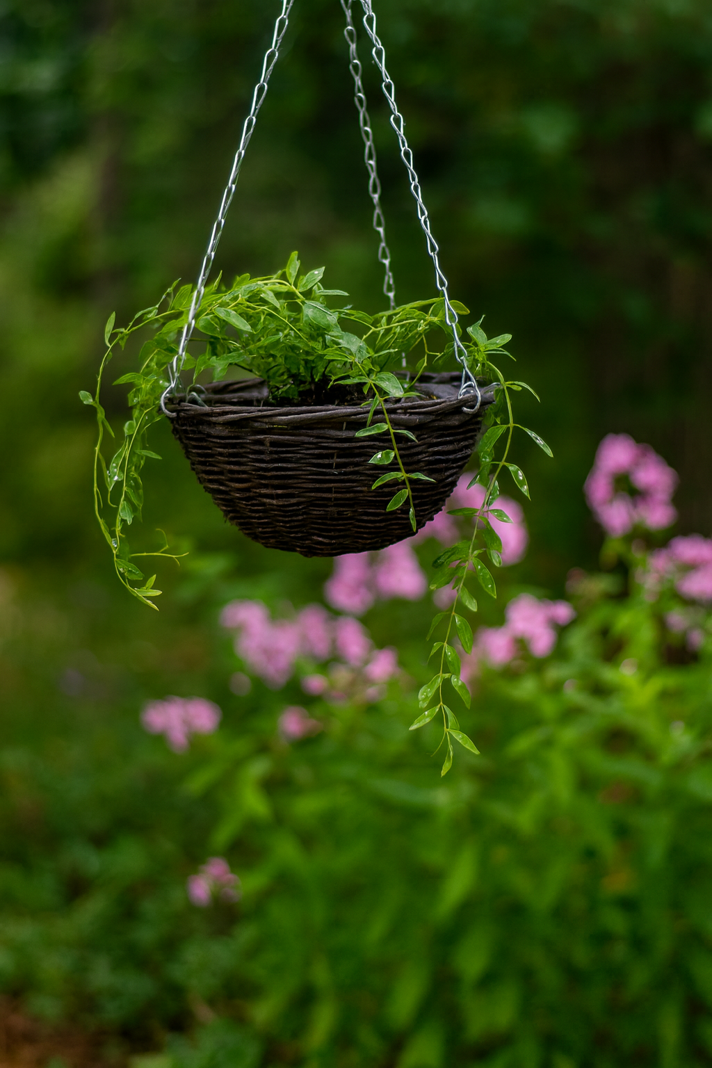 Wykonany z naturalnych materiałów kosz podkreśli piękno żywych roślin, zwłaszcza tych o długich zwisających pędach.