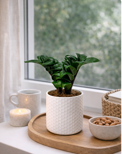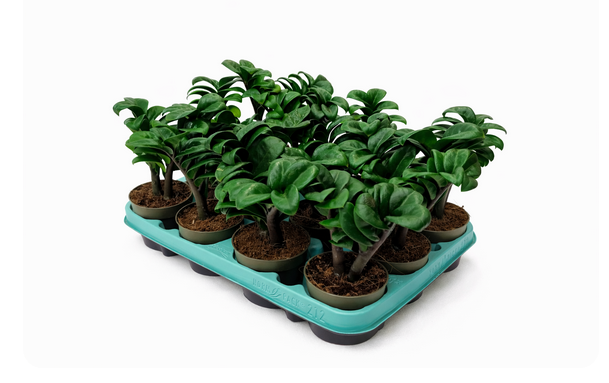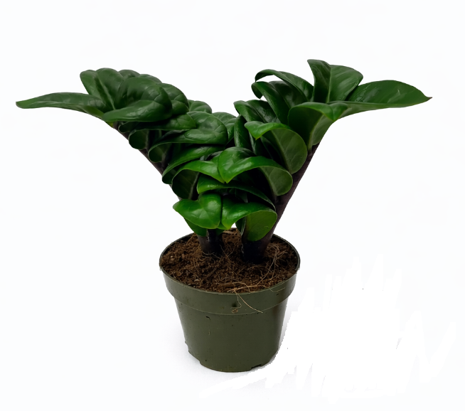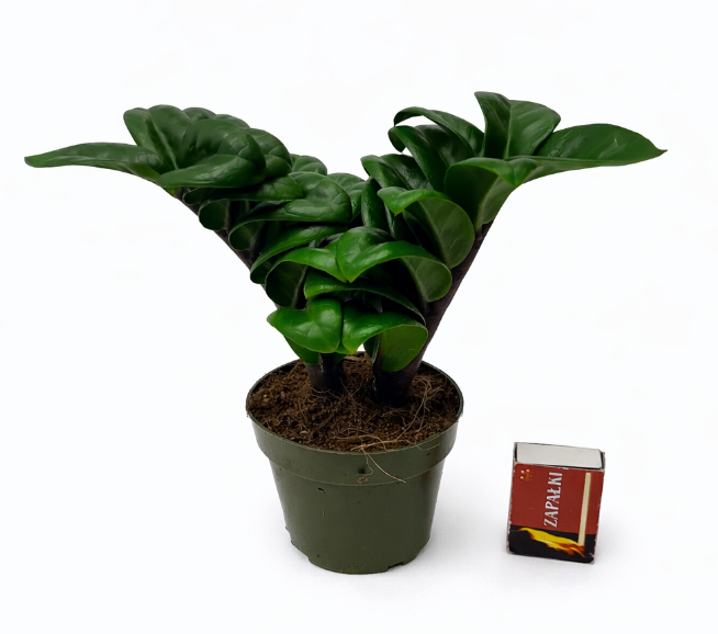 Zamioculcas Zenzi to wyjątkowa, karłowata odmiana popularnego zamiokulkasa, wyróżniająca się krótkimi, grubymi pędami oraz gęsto ułożonymi, błyszczącymi liśćmi w głębokim odcieniu zieleni. Dzięki zwartemu pokrojowi idealnie sprawdza się w mniejszych przestrzeniach i nowoczesnych aranżacjach wnętrz.